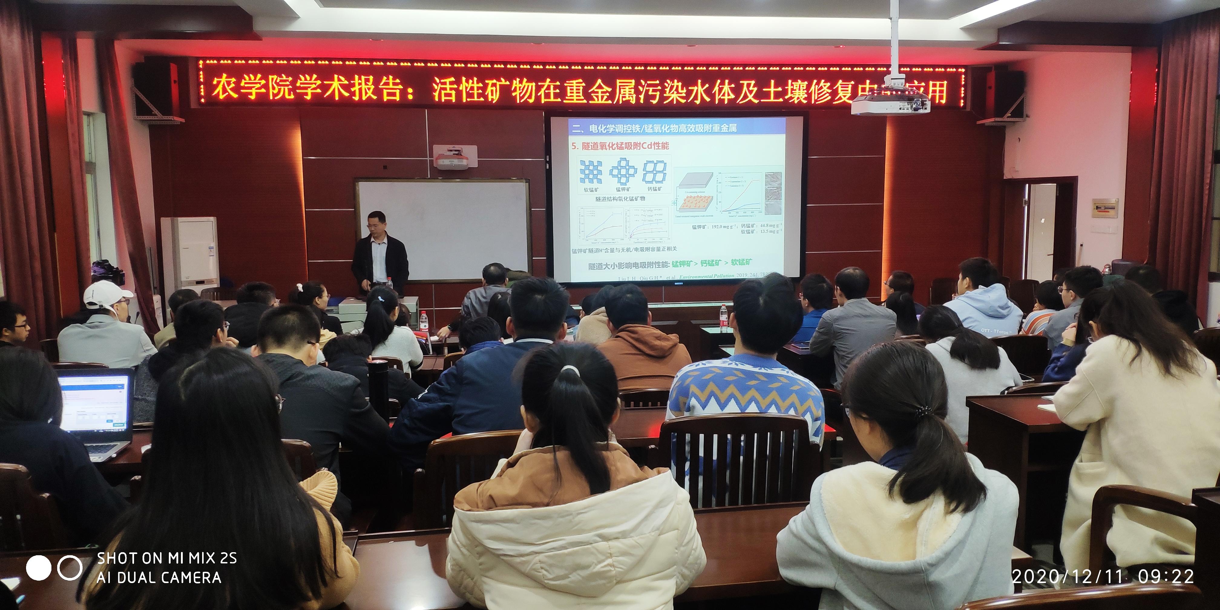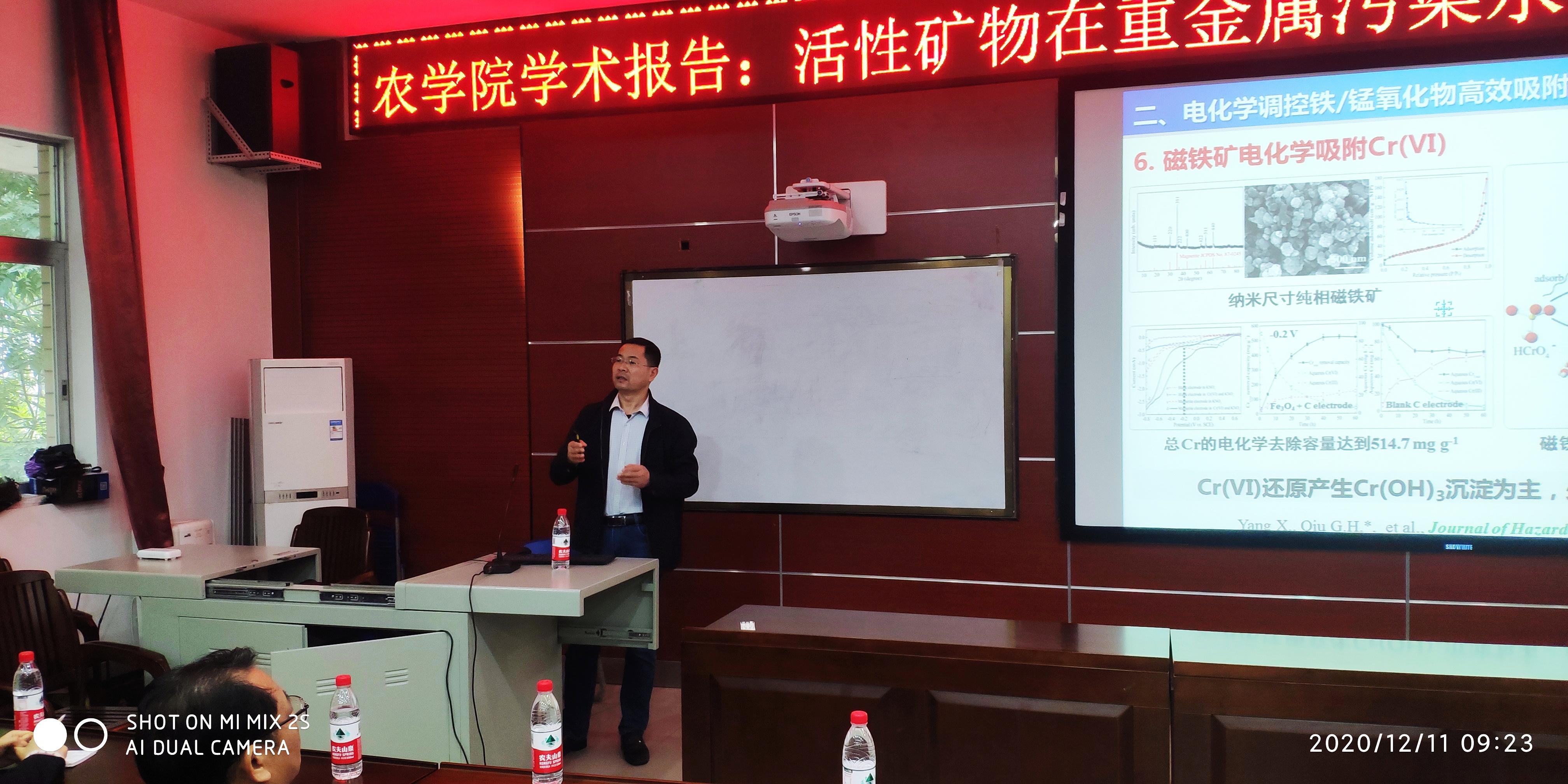 2020年12月11日上午,教育部新世纪优秀人才支持计划和中组部“万人计划”科技创新领军人才、华中农业大学邱国红教授应邀在sunbet申搏306报告厅作题为“活性矿物在重金属污染水体及土壤修复中的应用”的学术报告,报告会由王令强教授主持,公司副经理何新华教授代表公司欢迎邱老师的到访并做介绍,100多名师生聆听了报告。