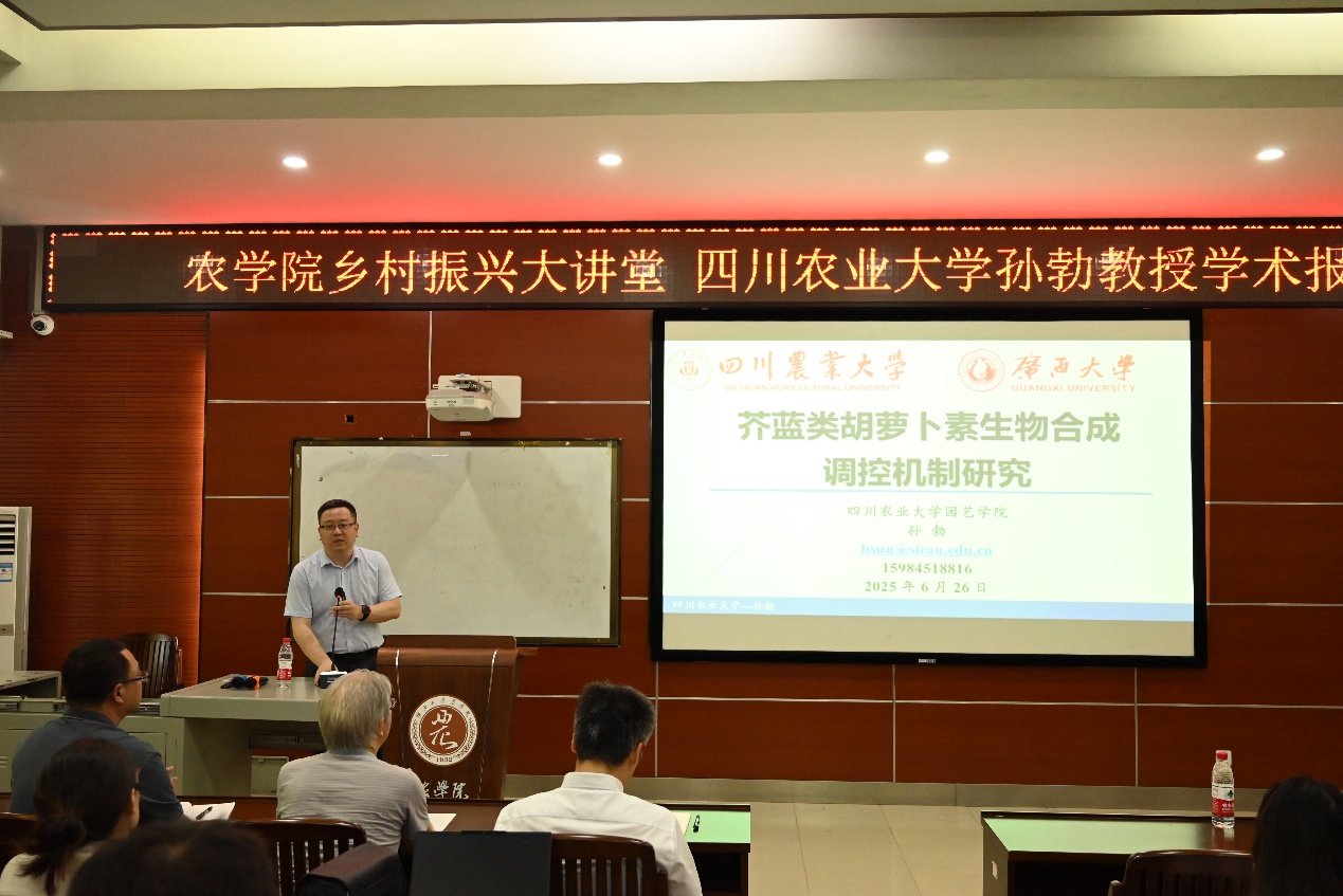 2025年6月26日,四川农业大学园艺公司副经理、博士生导师孙勃教授应邀莅临公司开展学术交流,并在“乡村振兴大讲堂”作题为《芥蓝类胡萝卜素生物合成调控机制研究》的专题学术报告。报告由sunbet申搏副经理邹承武主持,亚热带农业生物资源保护与利用国家重点实验室及sunbet申搏近百名师生到场聆听。