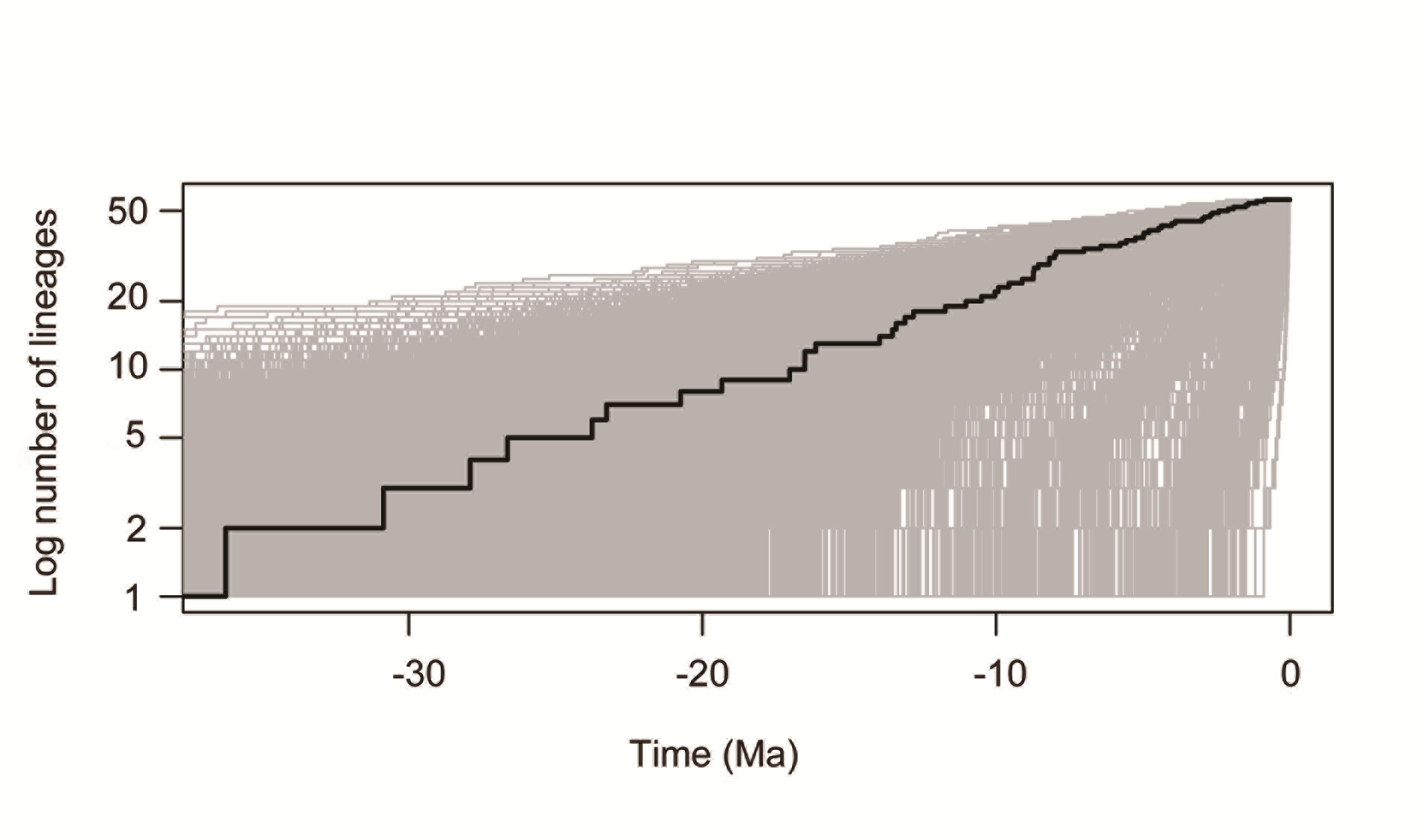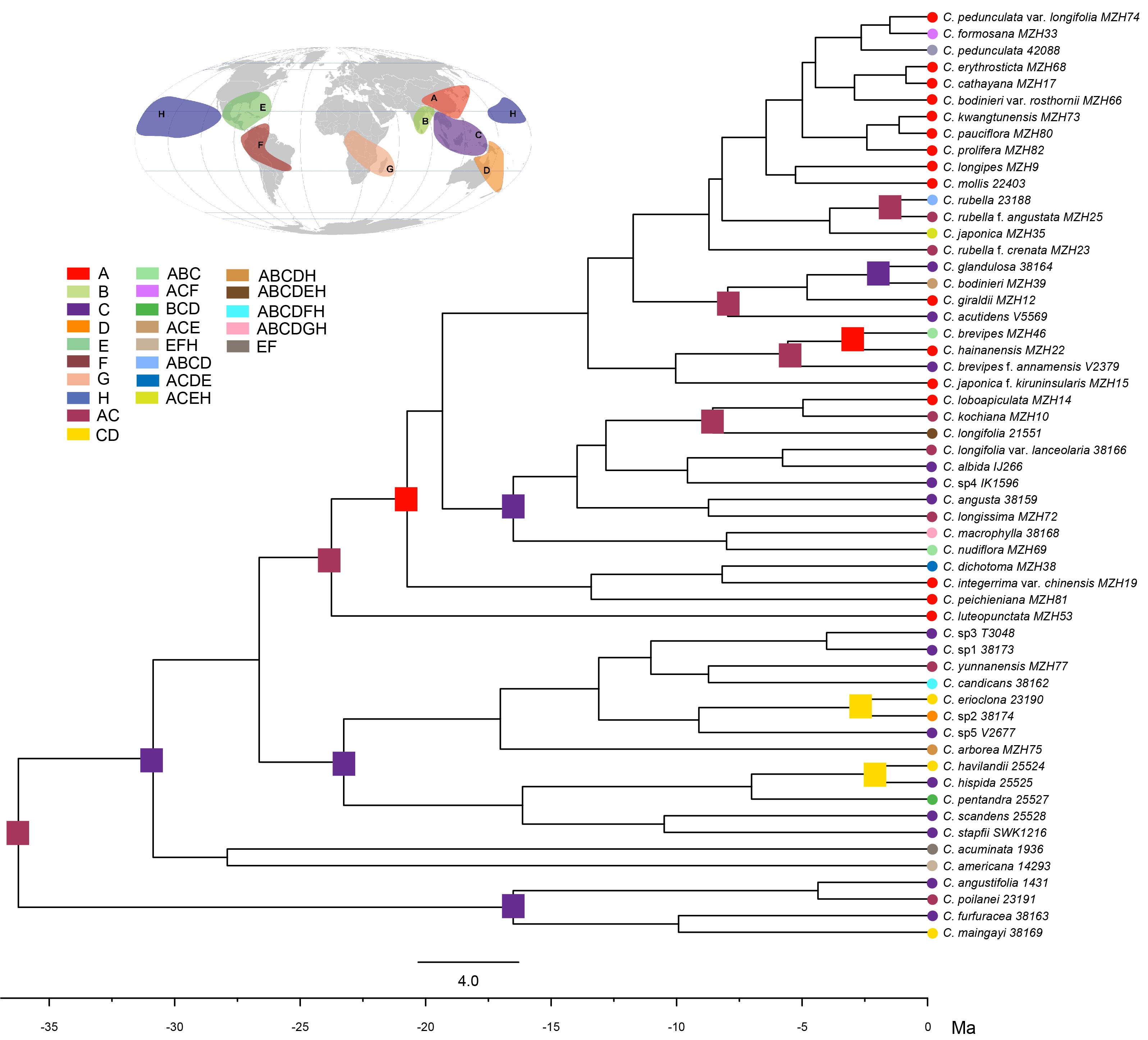 我们选取了紫珠属56个代表物种,共计145个样品。通过构建该属的系统发育并基于其系统发育框架,进行分化时间评估与祖先区域重建分析,推断该属的演化历史。通过生物地理学研究,对紫珠属的起源、分化、历史迁移进行推测。