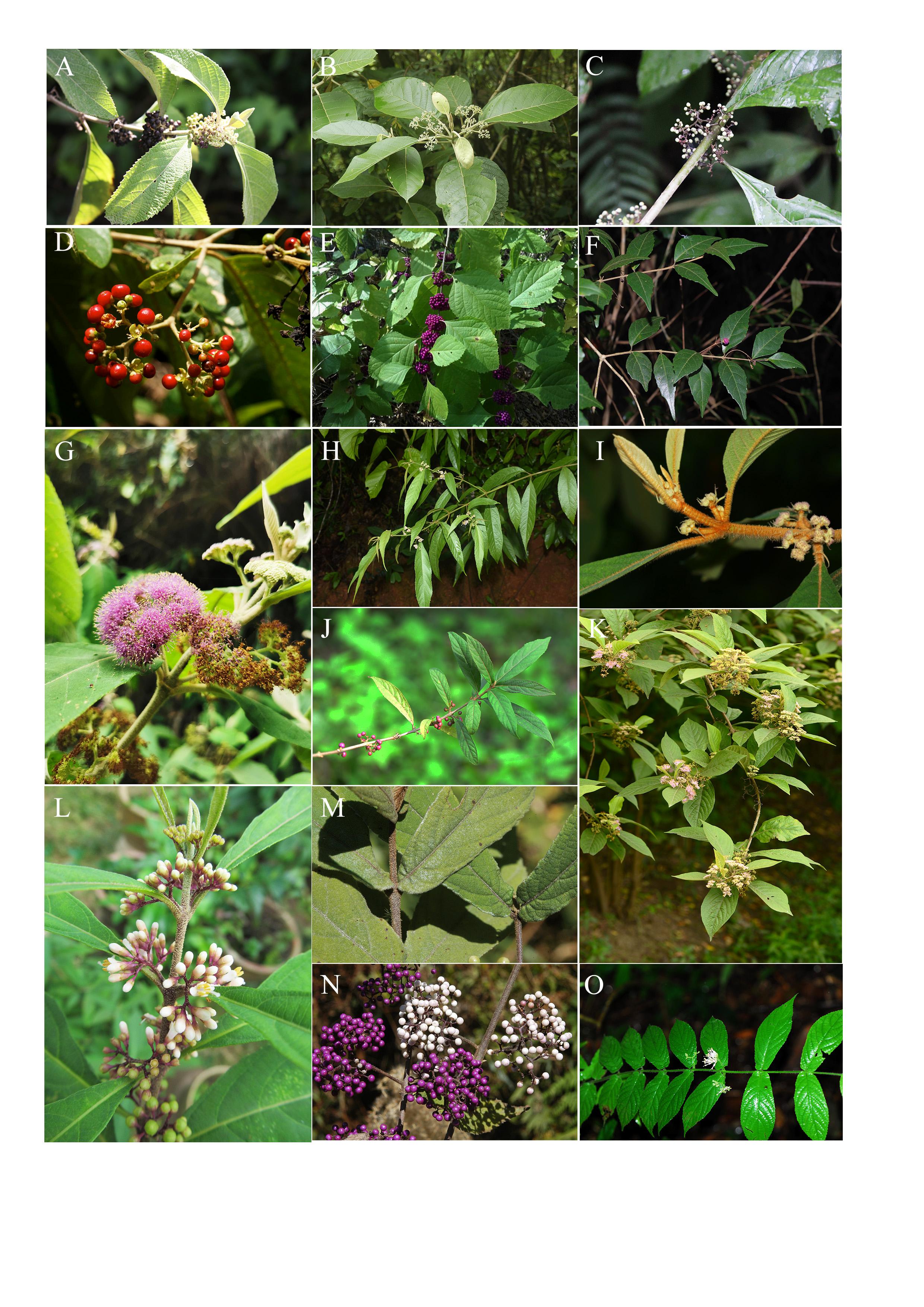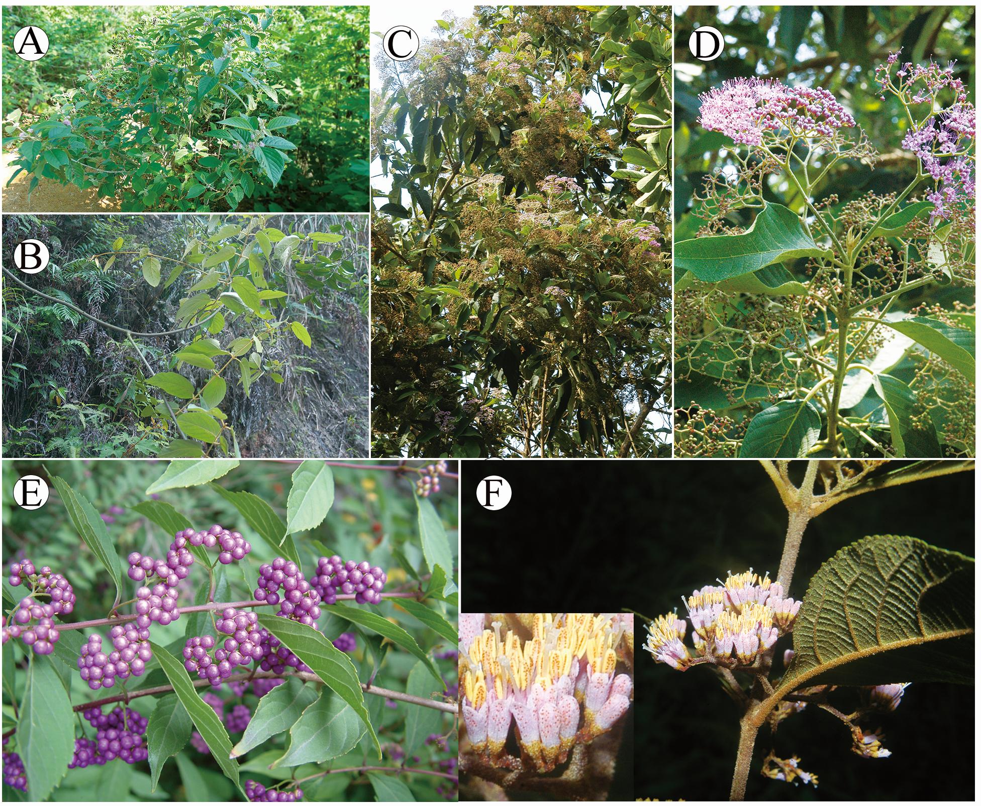 图5. 系统发育讨论涉及的紫珠属植物形态特征。