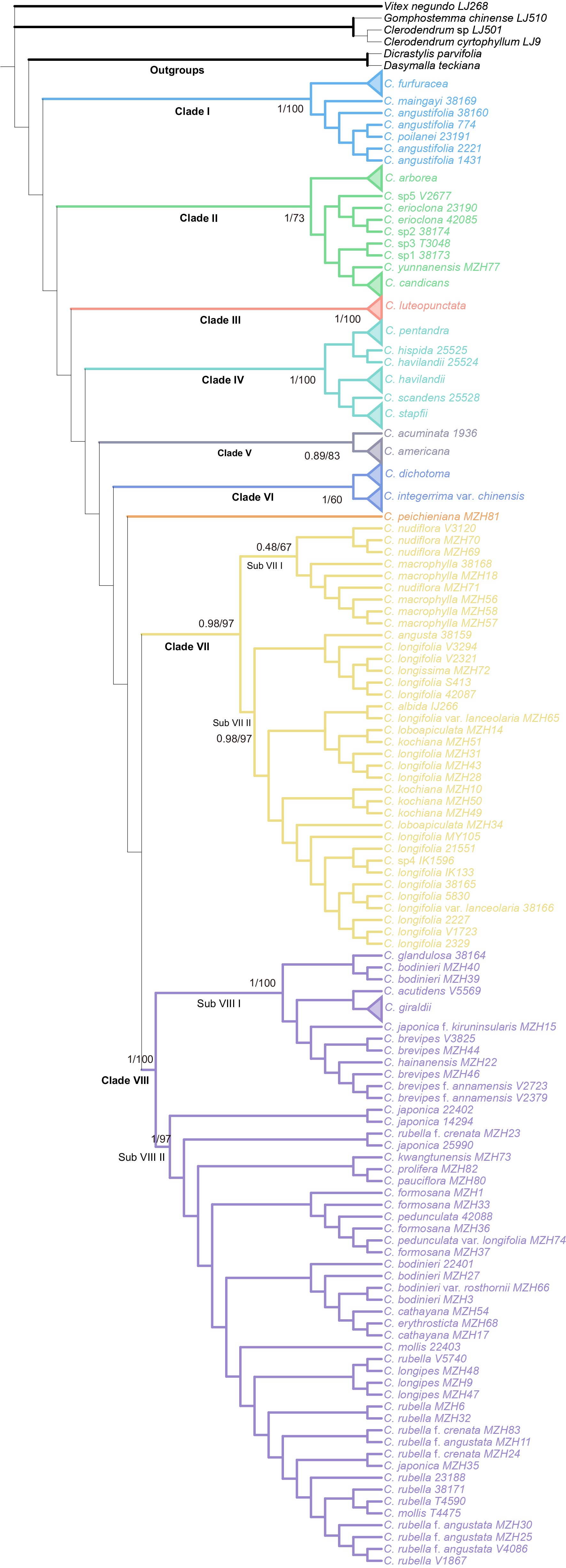 上述研究结果以“Phylogenetic relationships and biogeography of Asia Callicarpa (Lamiaceae), with consideration of a long-distance dispersal across the Pacific Ocean —insights into divergence modes of pantropical flora”为题发表于Frontiers in Plant Science第14卷(https://doi.org/10.3389/fpls.2023.1133157)。sunbet申搏硕士研究生蔡慧敏为论文第一作者,sunbet申搏马仲辉教授为通讯作者,本研究得到了国家自然科学基金(31760045, 31970220, 32260047)、广西自然科学基金(2018GXNSFAA281132)和广西甘蔗生物学重点实验室基金(GXKLSCB-202004)项目的资助。
