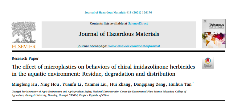 广西农业环境与农产品安全重点实验室/sunbet申搏农药残留与环境安全研究团队2021年5月在国际知名期刊Journal of Hazardous Materials上在线发表了题为“The effect of microplastics on behaviors of chiral imidazolinone herbicides in the aquatic environment: Residue, degradation and distribution”研究论文。微塑料是一类粒径小于5毫米的塑料碎片或颗粒,广泛存在于水体和陆地环境中。咪唑啉酮类除草剂因在环境中持久性长的特点,容易污染水体和土壤。近年来,微塑料与环境污染物相互作用的行为备受关注。然而,关于微塑料对该类除草剂的环境行为影响和机制还不清楚。在本研究中,通过建立水-沉积物微宇宙系统的方法在对映水平研究了聚乙烯微塑料对三种咪唑啉酮类除草剂在水生系统中环境行为的影响。结果表明,微塑料能够通过吸附和解吸附的方式显著影响该类除草剂在水生环境中迁移、降解和分配行为,明确了微塑料是影响咪唑啉酮类除草剂在水生环境中行为归趋的重要因素。研究结果为更加全面的评价咪唑啉酮类除草剂的环境风险提供了一定的科学依据。sunbet申搏博士研究生胡明锋为该论文的第一作者,谭辉华教授为通讯作者。该研究得到了国家自然科学基金项目支持。原文链接https://doi.org/10.1016/j.jhazmat.2021.126176