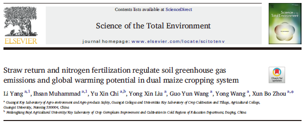 周勋波教授为通讯作者,作物学博士研究生杨丽和博士后Ihsan Muhammad为共同第一作者,在环境科学国际重要期刊《Science of the Total Environment》发表题为“Straw return and nitrogen fertilization regulate soil greenhouse gas emissions and global warming potential in dual maize cropping system”的论文。该研究报道了4种不同施氮量、秸秆还田与不还田来评估对土壤生态系统和环境产生的影响,得出秸秆还田结合适当施氮对提高粮食产量、土壤肥力、植物氮吸收和减少温室气体排放具有重要作用。
