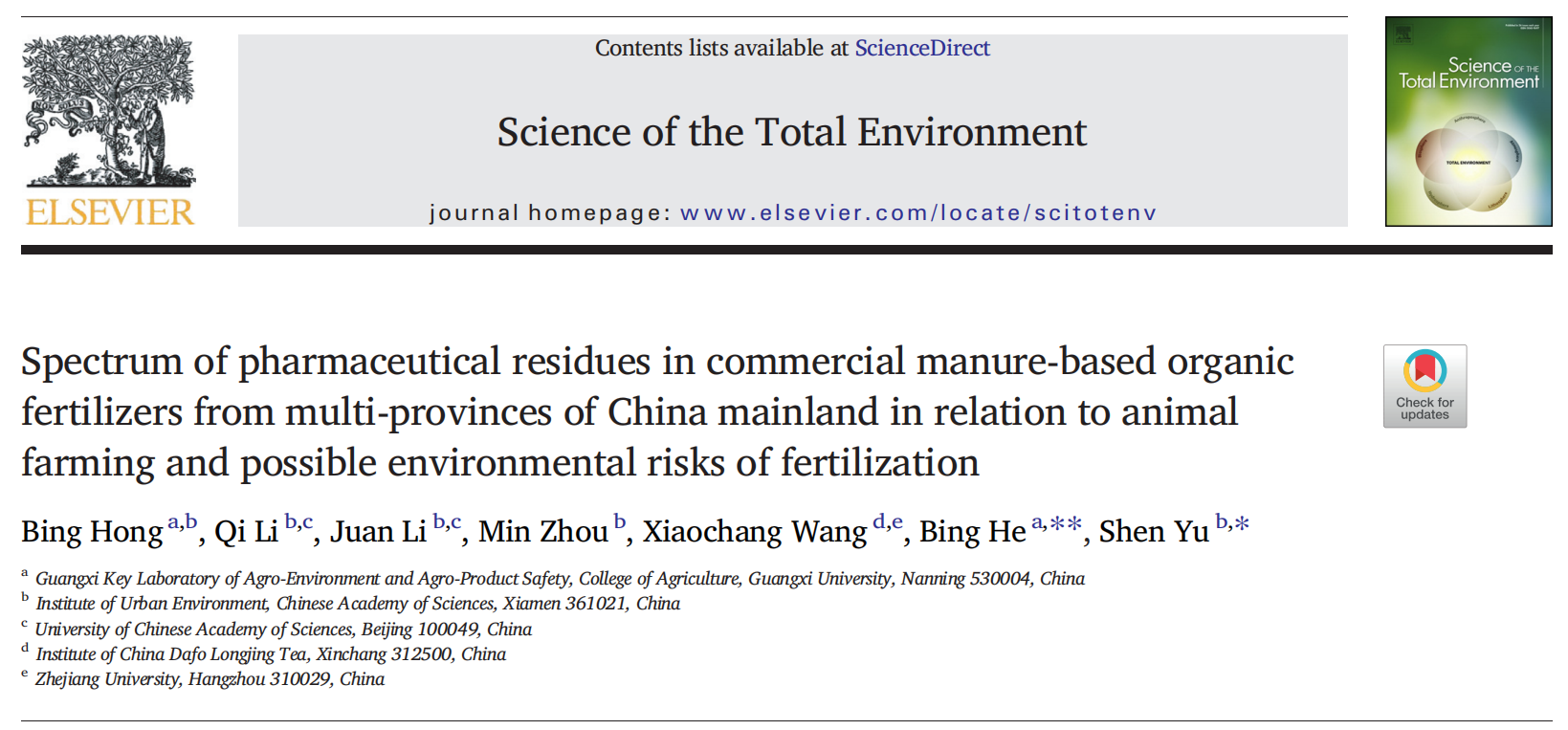 近日,sunbet申搏/广西“农业环境与农产品安全”重点实验室何冰团队和中国科公司城市环境研究所俞慎团队在《Science of the Total Environment》(环境科学与生态学1区Top期刊、影响因子10.753)期刊在线发表了题为 “Spectrum of pharmaceutical residues in commercial manure-based organic fertilizers from multi-provinces of China mainland in relation to animal farming and possible environmental risks of fertilization”的论文(论文链接:http://dx.doi.org/10.1016/j.scitotenv.2023.165029)。