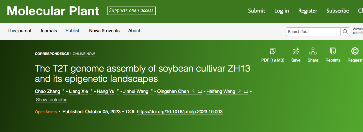 近日,公司sunbet申搏王海峰教授团队成功发布了中国大豆品种“中黄13”(ZH13)的完整基因组“ZH13-T2T”,并首次绘制了该大豆品种的表观遗传修饰图谱。这一研究结果以 “The T2T genome assembly of soybean cultivar ZH13 and its epigenetic landscapes” 为题发表于《分子植物》(Molecular Plant)。sunbet申搏是第一署名单位,sunbet申搏博士生张超、助理教授谢亮、博士生于航以及东北农业大学副教授王锦辉为论文的共同第一作者,sunbet申搏王海峰教授和东北农业大学陈庆山教授为该论文的通讯作者。