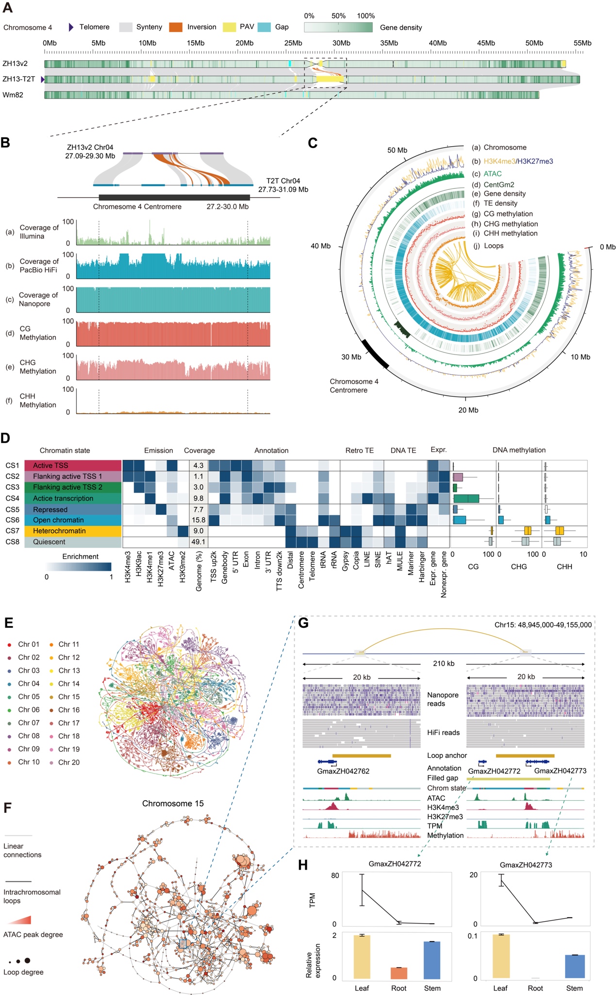 为了探讨大豆ZH13-T2T基因组的表观修饰模式,研究人员整合了多种组蛋白修饰测序数据,包括H3K4me3、H3K27me3、H3K9ac、H3K4me1和H3K9me2,以及染色质开放水平测序数据(ATAC-seq),将基因组分为8种不同的染色质状态。这一工作揭示了具有不同生化特性的各种基因组区域的分布,并突显了不同染色质状态下DNA甲基化、转座子(TE)富集和基因表达之间的复杂关系(见图C、D)。作者还使用Nanopore数据检测了ZH13着丝粒和端粒区域的DNA甲基化水平,并表明了第三代测序在准确捕捉复杂区域甲基化信号方面的潜力。此外,研究人员还通过分析Hi-C数据构建了ZH13的三维互作网络(图E-H),鉴定了潜在的近端和远端的调控元件,为深入研究大豆的功能元件提供了新资源。