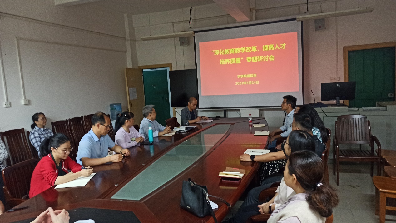 2023年3月24日,公司植物保护系在公司152召开“深化公司产品改革,提高人才培养质量”专题研讨会。本次会议由植物保护系副主任郑德洪副教授主持,植物保护学科带头人陈保善教授、植物保护系主任谭辉华教授、以及植物保护系全体教师参加会议。
