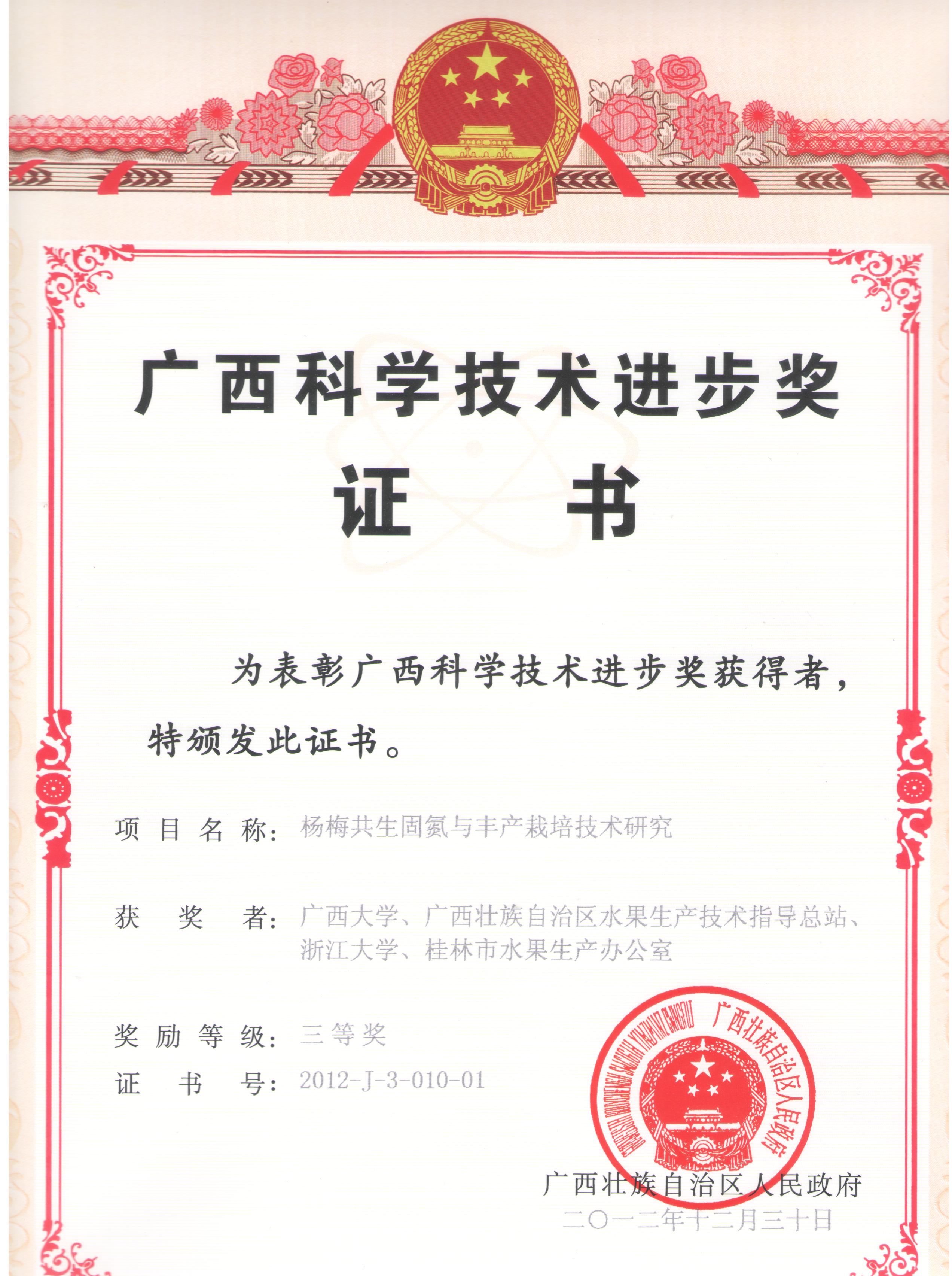 三等奖 何新华-杨梅共生固氮与丰产栽培技术研究获奖证书(2012、12)