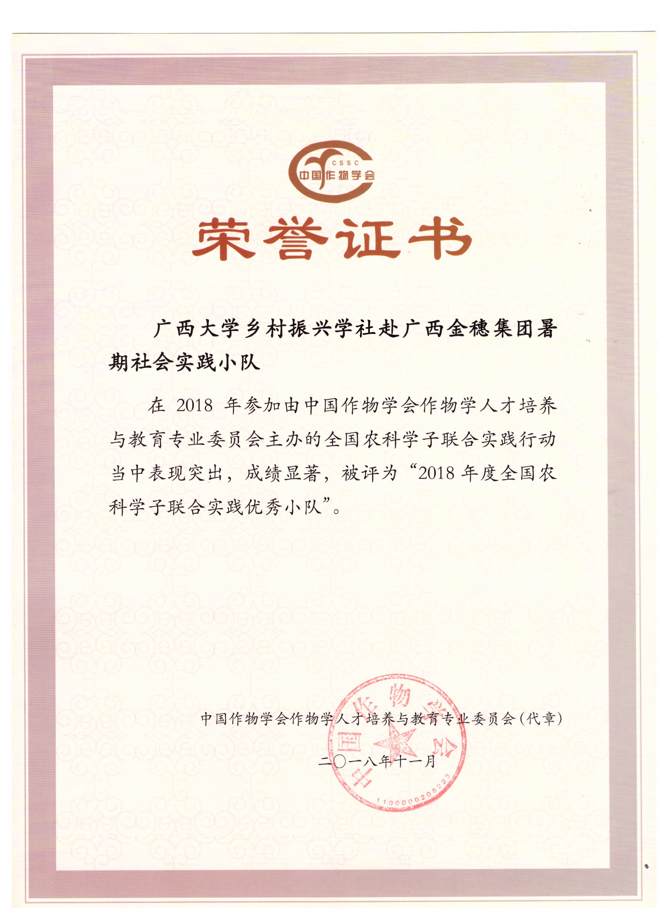 益农三江小队2020年度全国农科学子联合优秀小队奖